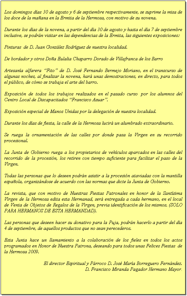 8 DE SEPTIEMBRE. Martes Festividad de la Stma. Virgen de la Hermosa. A las 8,30 de la mañana alegre diana floreada por las calles de nuestro pueblo, a cargo de la Banda de Cornetas y Tambores. A las 12,30 de la mañana SOLEMNE CELEBRACIÓN DE LA EUCARISTÍA, concelebrada por varios sacerdotes y presidida por el Rvdo. Padre D. José María Borreguero Fernández, director espiritual de la Hermandad y párroco, quien pronunciará la homilía. A las 8 de la tarde PROCESIÓN DE LA IMAGEN DE LA VIRGEN DE LA HERMOSA, que será acompañada en su recorrido por la Banda de Música de Fuente de Cantos. A la entrada de la imagen de Ntra. Sra., en su regreso procesional a su Ermita, el dúo “Aires Nuevos” interpretará UNA SALVE dedicada a nuestra excelsa Patrona. Al finalizar la procesión y mientras la Virgen se retira al interior de su Santuario, se cantará el himno de la Hermosa en su honor y en agradecimiento al esfuerzo de sus costaleros A las 10,30 de la noche SEGUNDA PARTE DE LA PUJA en la que se subastarán el ROSARIO y el RAMO que llevó la Virgen en la procesión. En el intermedio de la Puja se entregarán los premios de todos los concursos realizados en Nuestras Fiestas Patronales, en honor a la Virgen de la Hermosa.